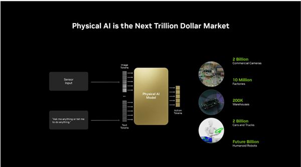 随后NVIDIA明确指出,继感知AI、生成式AI和智能体AI之后,下一个万亿级美元的市场将是物理AI,即能够理解物理定律并与现实世界交互的智能实体系统。