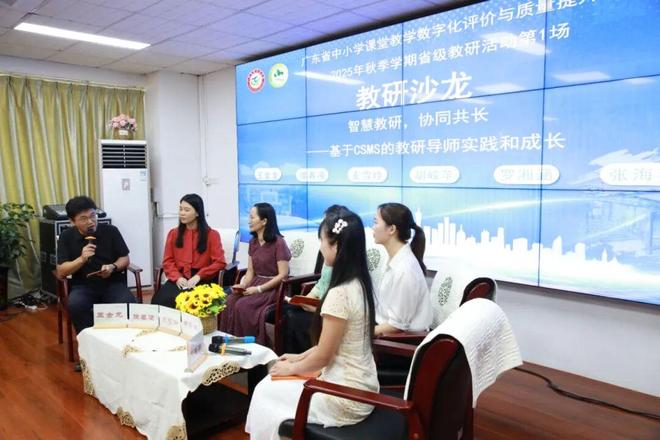 教研沙龙围绕“智慧教研,协同共长——基于CSMS的教研导师实践智慧和成长”这一主题展开,深圳市福田区第二实验学校王金龙、广州大学附属中学徐春凌、广州市白云区龙归学校麦雪玲、东莞市东城虎英小学胡嵘苹、佛山市禅城区张槎中学罗湘涵、广州市天河外国语学校张海英等6位专家教师,聚焦“角色跃迁——从实践者到指导者的转变”“共生共长——导师与被指导者的协同进步”“智能共塑——与AI共塑未来专业发展新愿景”三大话题深入交流,分享自身实践经验与成长体悟。